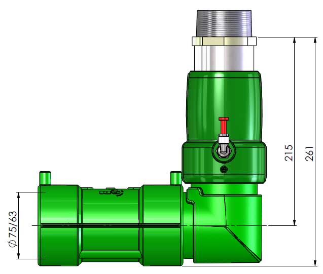 KPS double-wall elbow: 2 welding operations, total build 261 mm, cc build 215 mm.